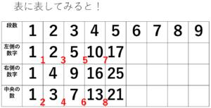■このような、数が連続で出てくる問題は、表に書いて考えると、見えてきます。